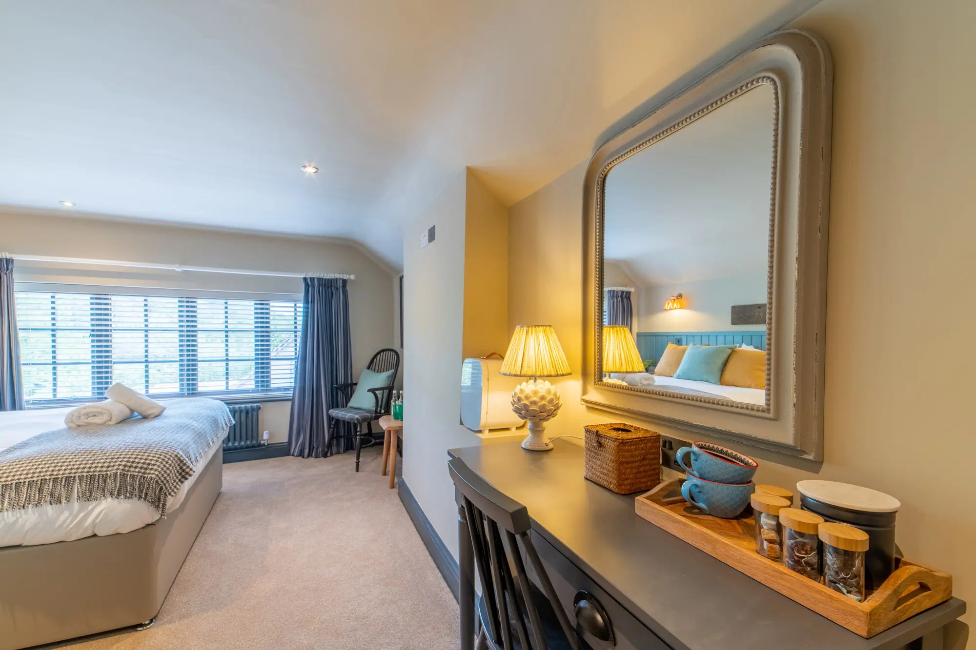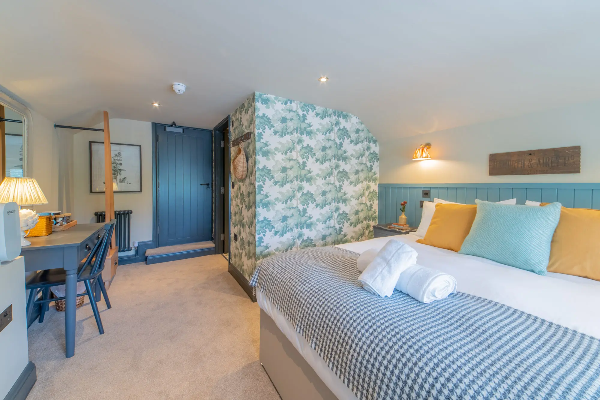 A cosy room with modern furnishings providing the perfect stay. Features of the room include a king sized bed, walk in shower, TV and a large desk.